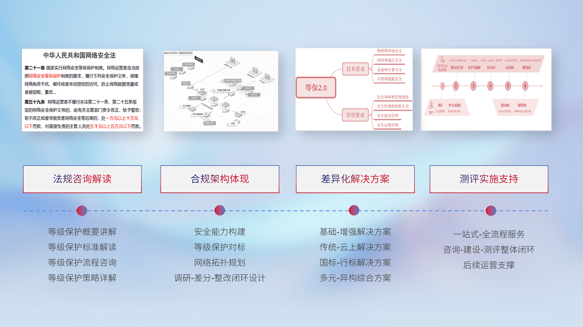 通过专业的法律咨询解读、、、合规架构体现、、、、差异化解决方案、、、测试实施支持等服务,,,为客户量身打造等保合规体系。。